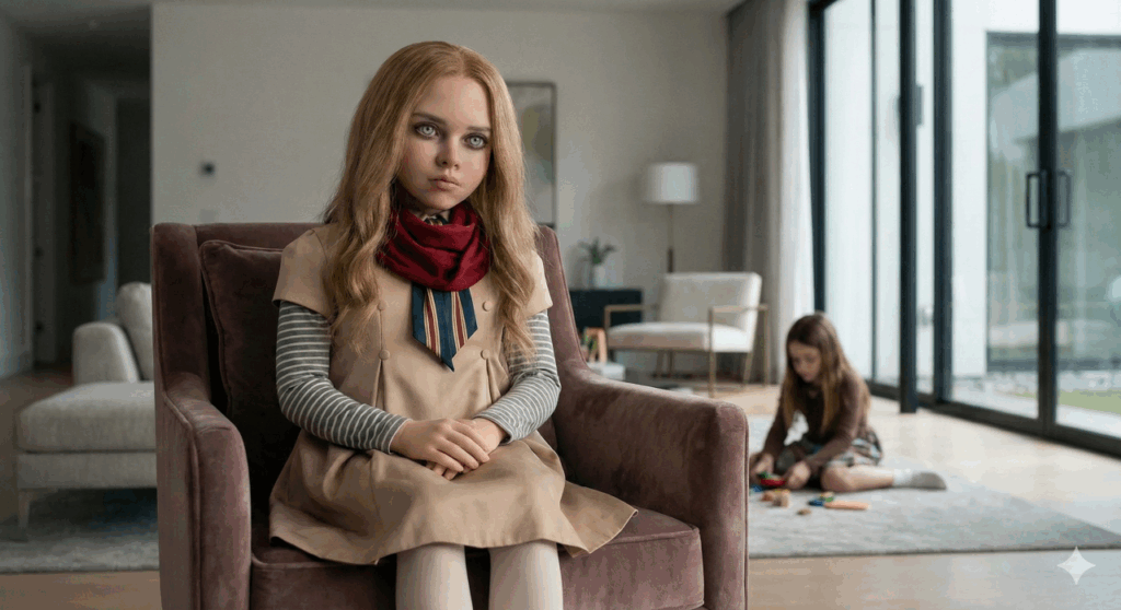 『M3GAN/ミーガン』に登場するM3GAN(Model 3 Generative Android)は、AIによる育児支援がもたらす悲劇を描く。